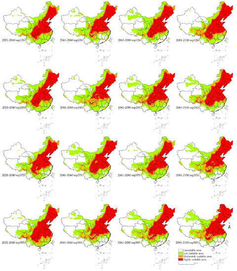 Predicted potential distribution of S. nitobei in China under the future climate conditions during the periods of the 21st century under four Coupled Model Intercomparison Project Phase 6 (CMIP6) climate scenarios, and including four shared socio-economic pathways (ssp126, ssp245, ssp370, and ssp585).