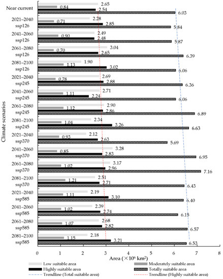 Under the future climate conditions, the periods of 21st century, including 2021–2040, 2041–2060, 2061–2080, and 2081–2010, under four CMIP6 climate scenarios, including ssp126, ssp245, ssp370, and ssp585 showed an increase in predicted area suitability for the distribution of S. nitobei in China, showing potential spread into unsuitable areas which are becoming suitable (Figure 6 and Figure 7). The total predicted area of suitability increases in the period 2061–2080 ssp370 and 2021–2040 ssp370, from 5.69 × 106 km2 to 7.16 × 106 km2, increasing by 18.74% in the former, and decreasing by 5.64% in the latter when compared to the total area of the suitable area under current climate condition. Similarly, the maximum highly suitable area appears in the period 2081–2100 ssp245, reaching an area of 3.26 × 106 km2, with an increase of 28.35% compared to the highly suitable area of the suitable area under current climate condition; while the minimum suitability area was predicted for the period 2041–2060 ssp245, reaching an area of 2.24 × 106 km2, with a decrease of 11.93% in suitable area under current climate condition. The moderately suitable area increased in the period 2081–2100 ssp370, increasing to 1.21 × 106 km2, with an increase of 44.05% compared to current climate condition, while a decrease was noted in the period 2061–2080 ssp126, reaching an area of 6.96 × 105 km2, with a decrease of 16.67% compared to the moderately suitable area under current climate condition. The predicted area of low suitability also shows similar trends, reaching an area of 3.28 × 106 km2 during the period 2041–2060 ssp370, with an increase of 23.77%, while the minimum predicted low suitability area reached was 1.90 × 106 km2 during the period 2081–2100 ssp126, with a decrease of 28.30% compared to the total area of the low suitable area under current climate condition (see Figure 7).