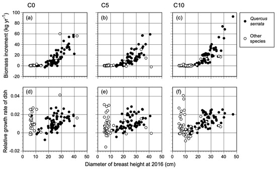 Size-dependent growth rate (annual biomass increments; (a–c)) and relative growth rate of the dbh (d–f) of all tree stems (dbh > 5 cm) in C0 (control), C5 (5 Mg ha−1), and C10 (10 Mg ha−1) treatments after biochar application to an oak (Q. serrata) forest.