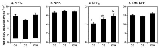 C5 and C10 tended to have lower and higher woody NPP (NPPW), including coarse roots, respectively, compared with the control plots (Figure 2a), but these differences were not significant (F2,9 = 3.51, p = 0.075). NPPF was nearly the same for all treatments (Figure 2b), with no significant differences across treatments (F2,9 = 0.95, p = 0.419). By contrast, NPPR increased along the application rate gradients, corresponding to 1.04 Mg ha−1 yr−1, 1.30 Mg ha−1 yr−1, and 1.47 Mg ha−1 yr−1 in the control, C5, and C10, respectively (Figure 2c). NPPR in C10 was significantly higher than the control (F2,9 = 4.65, p = 0.041). The total NPP in C10 was slightly higher than that of the control plots, mainly because of the higher NPPR (Figure 2d). However, this difference was not significant across treatments (F2,9 = 2.29, p = 0.157), because the contribution of NPPR to total NPP was fairly small.