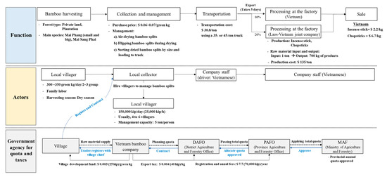 The value chain of the existing bamboo products produced mostly bamboo chopsticks and incense stick in Vietnamese markets, which required raw materials (i.e., dried bamboo splits) from local villages in Lao PDR. This value chain had the functions in the following order: bamboo harvesting, collection and management of bamboo splits, transportation, processing at factories, and sales (Figure 2).