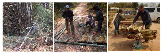 - After cutting down bamboo stands, the villagers split the bamboos into seven sizes: 65 cm, 75 cm, 82 cm, 92 cm, 102 cm, 112 cm, and 122 cm (Figure 3a,b).