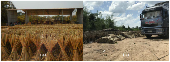 Bamboo collection and management: (a) air drying bamboo splits and (b) loading bamboo splits into a truck owned by a Vietnamese company.