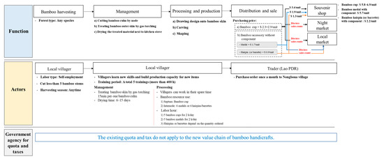 Another sales route was direct sales by participating in events such as local festivals or national handcraft festivals (Figure 8b). In this case, local villagers were the only actor in the value chain from bamboo harvesting to sales. For example, the villagers went to the Sangthong District Festival and sold 25 bamboo cups, generating a total revenue of $70.2 (625,000 kip) by six people or $11.7/person (104,000 kip/person) in a day. Lao PDR had a monthly minimum wage of $124 (1,100,000 kip) as of 2018 [37] and a daily wage of $5.4–6.7 (50,000–60,000 kip) in rural areas [38]. Therefore, the new bamboo model could be highly profitable, thus contributing to cash circulation, and improve local livelihoods in Lao PDR.
