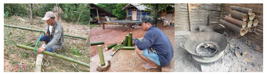 After harvesting green bamboos, the participants cut bamboo culm by node (Figure 6a), treated bamboo outer skin by gas torching (Figure 6b), and dried the treated material next to a kitchen stove (Figure 6c). This process was a key step for producing high quality bamboo handicrafts and improving the product life. This drying method is similar to kiln oven drying that is a commonly used method to dry bamboo culms [4]. Advantages of kiln drying is easy to control drying conditions and the required final moisture content in short time. It can also ensure higher level dried bamboo quality than air drying. However, the kiln oven/machine is difficulty to build/purchase and maintain in rural areas and only a small amount of bamboo is needed for handicrafts. A kitchen stove was used instead, which can result in similar effects.
