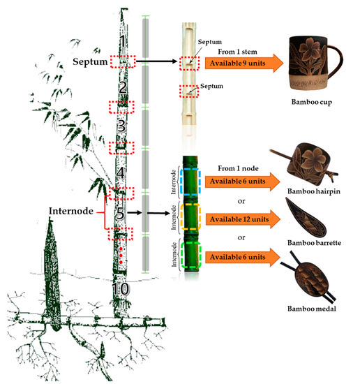 Each bamboo item needs a different part from bamboo culm (Figure 7). Bamboo cups need a septum for the cup bottom. The internode of which the septum was taken away for a bamboo cup can be used to produce 6 round-shaped medals, 6 ornamental hairpins, or 6 barrettes (hairclips), thus creating highly added value per bamboo stem.