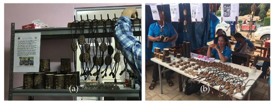 Small agriculture producers in developing countries are often linked with buyers through spot market-type transactions. Thus, the new bamboo model also needs to secure sales routes for the products. In 2019, a distributor (middle trader) visited the village and purchased bamboo handicrafts (Figure 8a). The purchase price of bamboo cup was $2.3–2.9 (20,000–25,000 kip) per unit depending on the cup size, which was decided based on the sales trial price. The price of bamboo medal was decided to be $1.7 (15,000 kip), and the hairpin and barrette were $0.9 (8000 kip) per piece. The distributor sold the bamboo cup, medal, hairpin, and barrette to souvenir shops at prices of $3.4 (30,000 kip), $1.9 (17,000 kip), $1.3 (12,000 kip), and $1.3 (12,000 kip). These bamboo products were sold at prices of $5.8–6.9 (52,000–61,000 kip), $5.7 (51,000 kip), $2.2 (20,000 kip), and $2.2 (20,000 kip), respectively, at the souvenir shops (Figure 5).