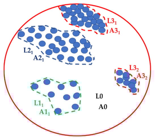 Graphic representation of the estimated areas (Akj) corresponding to the biomass production levels (Lk) within a single sample area, calculated in relation to the vegetation density.