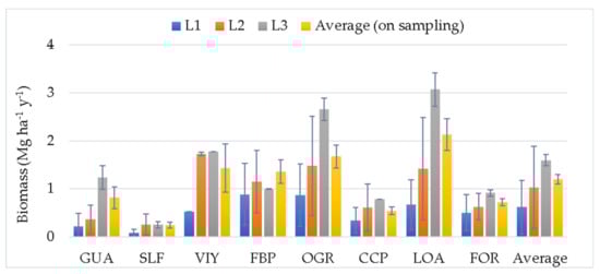 Average value (±standard error) of biomass available (Mg ha−1 year−1) in reference to the production level (L) and biomass class.