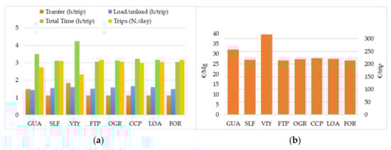 The results are expressed in relation to the different typologies of biomass sources. Figure 3 shows the estimate of the quantity of biomass available in the territory examined in relation to the production levels (L) and the biomass classes. The land principally occupied by agriculture (LOA) class is the one with the highest average value (2.13 Mg ha−1 year−1), with the highest incidence of L3 (3.07 Mg ha−1 year−1). The class that contributes less is SLF with 0.25 Mg ha−1 year−1. In Figure 4, we report the average time consumed (Figure 4a) and relative average costs (Figure 4b) for the load, transport, and unload operations of the residual biomass for each class. The highest time is request for the VIY class with 4.23 h trip−1, while the shortest time is recorded for the FOR class, with 3.04 h trip−1. The other biomass classes record intermediate times between 3.05 and 3.50 h trip−1. The load/unload time is highest in the CCP class with 1.65 h, followed by LOA and VIY with 1.61 h, while GUA requires the lowest time of 1.44 h. The trend in average costs per trip reflects that the times with the highest value of €316.31 trip−1 was VIY, corresponding to €39.54 Mg−1, and the lowest value was €213.84 trip−1 for FOR, that is €26.73 Mg−1.