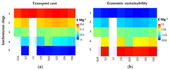 It should be noted that, with regard to the VIY class, it is not widespread in the observed area, therefore it is not to be considered a representative figure for this class. For the other classes, on the other hand, there is a greater homogeneity of results for the classes considered in the agricultural field such as FTP, OGR, CCP and LOA. Figure 5 shows the matrix graphs of the average transport cost (Figure 5a) and economic sustainability (Figure 5b) per Mg, in relation to the biomass classes and isochronous rings. In this figure, it is clearly seen how the distance from the biomass plant is very important. The cost increases by proceeding from the 5th isochronous ring (travel time 0–20 min) to the 1st (50–60 min).