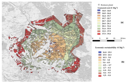 This is valid for all classes even if in a different way. The average costs vary from a minimum of about €14 Mg−1 in the area of the 5th ring, to a maximum of about €39.80 Mg−1 in the 1st ring. Economic sustainability is inversely proportional to the costs incurred. The red and yellow colors indicate the areas of greater sustainability, coincident with the 5th and 4th ring (positive values). The 3rd ring represents the boundary area between positive and negative values. The 2nd and 1st ring areas are always associated with negative values and indicate an uneconomic condition of the operation. Figure 6 shows the territorial map in which transport costs are associated with specific areas of the map. From this map it is possible to check the cost of transport (Figure 6a) in relation to the distance from the biomass loading point to the unloading point near the transformation plant. The conditions of economic sustainability (Figure 6b) show positive values in the areas ranging from yellow to blue (near the biomass plant).