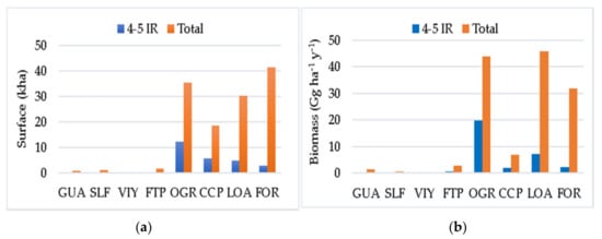 Total surface investigated and surface of the 4th and 5th isochronous ring (IR) (a) and total residual biomass available and biomass on 4th and 5th isochronous ring (IR) (b), where economic sustainability is verified, for each class considered.