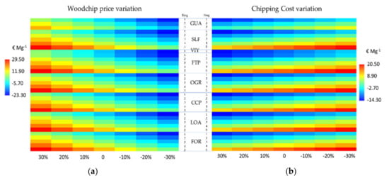 The market price of the woodchip and the chipping cost can represent a critical aspect of the model. A sensitivity analysis on these parameters showed in Figure 8 reveals, for example, that a 20% reduction in the value of the woodchip (Figure 8a) would make most of the biomass classes uneconomic even in the ring closest to the biomass plant, while the same negative effect is obtained if the cost of the chipping operation increased by over 30% (Figure 8b). On the contrary, with the increase of the same percentage of the price, the recovery of biomass becomes convenient for almost all classes in all rings, while the same result is obtained if the cost of the chipping operation is reduced by more than 30%.