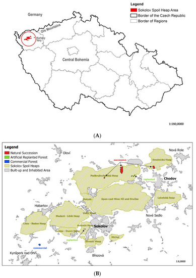 Study area. (A) The geographical position of the Sokolov spoil heap area in the Czech Republic; (B) the geographical location of individual spoil heaps and investigated sites of forest stands in the Sokolov region.