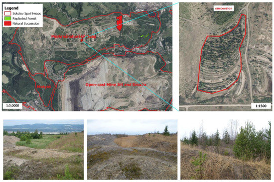 The heaps are covered by a mosaic of reclaimed and unreclaimed sites, where the terrain of reclaimed sites had been leveled before the tree were planted. Compared to that, no leveling had been carried out at the unreclaimed sites, where heaping machinery deposited overburden into a parallel series of waves (ridges and depressions), which are of different heights (from 1 to 5 m high) and several meters apart [39,40]. The geographical position of unreclaimed sites covered by spontaneous succession is illustrated for the Podkrušnohorská heap on the orthophoto map and the corresponding waves are shown on the photographs in Figure 2.