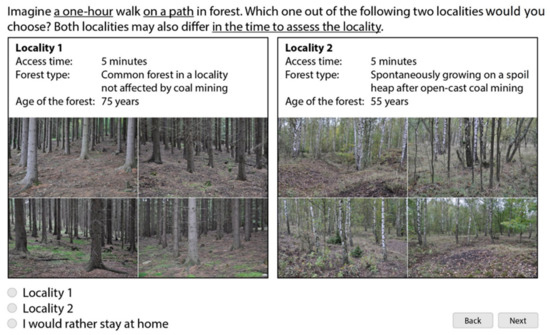 The indirect measure assessed a person’s choice of a forested locality for recreation obtained in a simple discrete choice experiment. DCE is a special type of survey that presents hypothetical choice tasks to respondents and allows us to estimate the impact of characteristics of the choice alternatives (called attributes) on a person’s choice [44]. The preferred alternative in each choice task is analyzed by means of statistical analysis, commonly multinomial or conditional logit model e.g., [45]. The choice task in DCE said: “Imagine a one-hour walk on a path in a forest. Which one out of the following two localities would you choose? Both localities may also differ in the access time to the locality”. The choice task had two alternative localities for recreation and an opt-out alternative worded as: “I would rather stay at home”. The alternatives in DCE were characterized by three attributes: type of the forest stand represented by the tree species on the photographs, age stage of the forest, and access time to the locality. Access time in minutes of walk indicated behavioral costs related to the particular alternative and had the following four levels: 5, 10, 20, and 25 min. The age class of the forest stand did not vary orthogonally across the tree species displayed on the photographs, but additionally characterized a particular forest type. In effect, an example of a forest evaluated in DCE was a 35-year-old forest planted on an open-cast coal mine spoil heap, which was represented by a quartet of photographs with spruce forest stands. The labels above the photographs additionally described the forest type and the age class. An example of the choice experiment question is displayed in Figure 3. Note that the design of the DCE had to account for the fact that only selected combinations of forest type (i.e., prevailing species of trees), age class, and origin of the forests (spontaneously growing or planted) exist and were thus available for photographing (see Table 1).