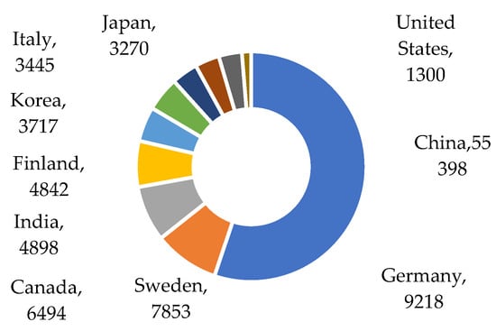 In recent decades, China has quickly become a major trading country in forest products and it plays a key role in the global forest product trade market. The trade in forest products is conducive to the country’s comparative advantages and promoting the development of China’s forestry industry. China’s forest products industry has gradually emerged from its large-but-weak position and begun to mature and participate more competitively in global value chains. As a result of low-cost manufacturing and the surge in foreign demand, China has become a center for the remanufacturing and redistribution of wooden products [1,2,3]. However, the studies of Moinul et al. (2016) have shown that imports and exports of wooden forest products can result in pollution, and the environmental impacts of trade in wooden products have aroused great concern [4].