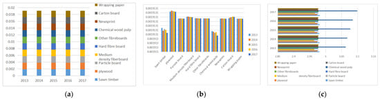 As can be seen from the Figure 5, in terms of environmental trade competitiveness (a), the difference between various products is not big and the annual change is not obvious. This is because the production process of the research object has not changed obviously in the research years, or the production process of the research object has changed, but the improvement in the production pollution emission is not obvious. From the perspective of pollution treatment (b), the score of the medium density fiberboard is the lowest, whereas the score of chemical wood pulp is the highest and has the highest growth rate from 2013 to 2017. From the perspective of trade scale (c), the comprehensive score of the trade scale of plywood is the highest, whereas that of chemical wood pulp is the lowest and the annual growth rate of carton board is the highest at this level.