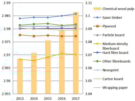 The forestry industry has relatively high levels of energy consumption and material consumption [5]. The development of the forestry industry will impact not only the environment but also the economy [6]. In the trade of wood products, exports cause pollution-intensive production, and imports relieve environmental pressure to some extent [7]. Forest industry companies are the main exploiters of forest resources, and their actions may have a significant impact on the sustainable development of forests [8]. Production and trade statistics for forest products are the basis for studying the economic and environmental performance of the forest sector [9]. At this stage, the technology and facilities in the production and processing of wooden forest products are imperfect, and their industrial design is limited. The development of the circular economy has set up obstacles [10,11]. The effects of the production and trade of a country’s forest products on the economic environment should be considered. The contradiction between economic benefits and the ecological environment should be urgently coordinated, while optimizing the economic strategy of the country for wooden forest products. Therefore, it is necessary to study the green development of the forest product trade, which is conducive to the improvement of national innovation and strategy in the manufacturing and trading of wooden forest products.