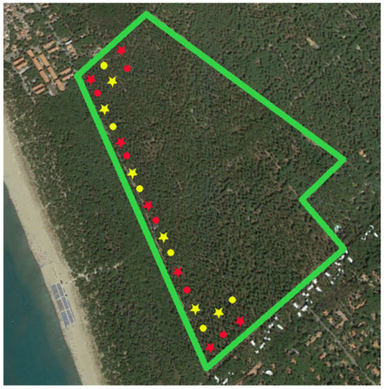 Study area with trap pattern as applied in 2019. Part of the coastal pine stands in the Municipality of Grosseto (Tuscany, Italy) is shown; the green line delimits the study area’s borders. Bait rotation alternated groups A (in red) and B (in yellow; symbols indicate modified (stars) and standard (circles) traps.