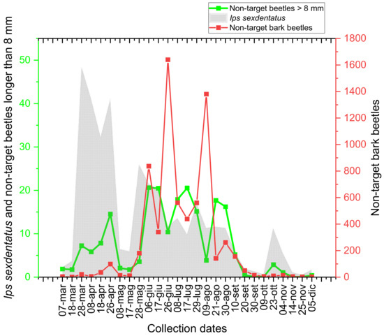 Another important strategy to reduce the impact of mass-trapping on non-target beetle species is to adjust the period of traps set in the field, exploiting the different seasonal abundance of target and non-target beetles. Overall, we observed the lowest non-target catches during autumn, both as regards beetles > 8 mm long and non-target bark beetles (Figure 4). This is in agreement with other studies that confirmed the lowest flight activity of bark beetles’ predators during autumn [20,27], or at least their higher activity during spring [18,25]. The highest catches of I. sexdentatus in our study area occurred, on the contrary, in autumn, at least in the 2016–2018 period. This was not confirmed in 2019; however, this was likely due to the phytosanitary felling of numerous attacked pines in the study area which was carried out at the end of 2018. As a result, I. sexdentatus population density was reduced, and the study area traits were also modified significantly.
