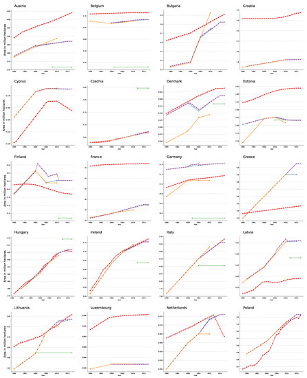 The main goal was to compare the changes in biomass volumes. Since these changes are always normalized by the area, it is natural to start comparing forest areas first (Figure 2). For SOEF, HPFFRE and FRA, the total forest area excludes other wooded land, i.e., land not defined as forest, though it should be noted that forest infrastructure such as roads and ditch networks can be reported under forest land. The maximum forest area is shown for each country in Table A2 and Table A3 compares the forest area for the most recent years available in each source. In most countries, the total forest area reported by FAOSTAT is identical to the one reported by SOEF. The former has a periodicity of one year while the latter has a periodicity of five years. Additional points in FAOSTAT’s yearly data have been obtained by interpolation as is visible in the changes of slope for Denmark and Bulgaria, for example. As the dynamics reported by SOEF and FAOSTAT are highly similar, we will focus on the comparison between the IPCC and SOEF forest areas for the rest of this section.
