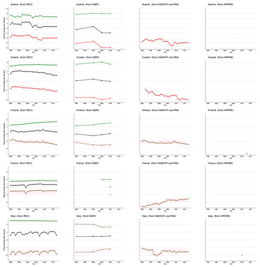 Comparison of the time series of forest dynamics for a selection of countries. All sources are expressed in the same unit (tonnes of carbon).