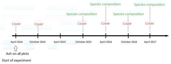 Timeline for a field experiment where bryophytes on a Norway spruce forest floor treated with wood ash were monitored over a period of three years. At experimental onset in April 2014, we applied six levels of ash to 2 m x 2 m plots, with five replicates of each treatment, i.e., 30 plots in total. Image analysis of bryophyte cover was performed in April 2014, October 2014, October 2015, April 2015, October 2016, and April 2017. Pinpoint registration of species composition was performed in October 2015, April 2016, October 2016, and April 2017.