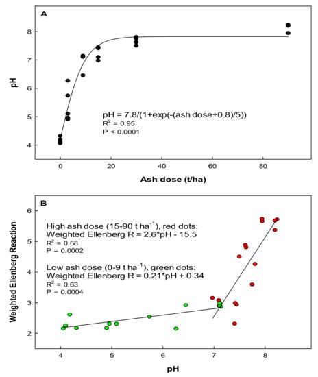 (A) Correlation between wood ash dose and soil pH 2.5 years after ash application in 30 plots treated with six different levels of ash. Soil pH values are based on mean values for three samples in each of the 30 plots. (B) The relationship between pH and weighted Ellenberg reaction (R) values 2.5 years after ash application. We used Ellenberg values from Hill et al. (2007) and calculated the weighted Ellenberg reaction value in each plot by multiplying the Ellenberg reaction value with the species frequencies in each plot. We divided the values into two groups, those corresponding to the low ash doses (0–9 t ha−1) and those corresponding to the high ash doses (15–90 t ha−1). In both cases, simple linear models showed a positive correlation between pH and Ellenberg reaction (R) values, but for the higher values, the slope was steeper, which suggest that direct ash effect was more prominent than the pH shift.