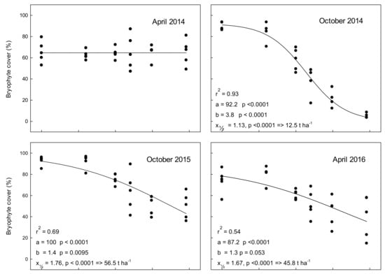 Total bryophyte cover (%) in experimental 2 m × 2 m plots treated with different levels of wood ash in April 2014 and subsequently evaluated by photo image analysis. Ash doses corresponded to application of 0–90 t ha−1. Note that, in addition to the strong negative relation between ash application and bryophyte cover, moss cover was significantly more developed in autumn than in spring. Time 0 (April 2014) corresponds to bryophyte cover prior to ash application. Dots represent individual measurements and the solid lines show data modelled by the simple three-parameter logistic equation y = a [1 + exp(b(x − x½))]−1 often used for dose response relationships []. Here, “a” is the cover in untreated plots (as suggested by the model), “b” indicates how strongly bryophyte cover decreases with ash dose, and “x½“is the value suggested by the model that reduces cover by 50%. Thus, the ash dose predicted by the model to reduce cover by 50% will be 10x½ + 1.