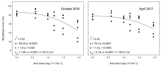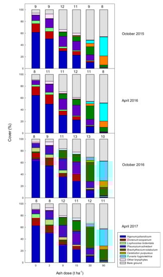 Depending on the ash dose, immediate ash effects include discoloration or death of the bryophyte shoots. We observed burning effects on bryophytes after ash application in all ash treatments, which resulted in lower cover and the effect increased with increasing ash doses (Figure 3). At small ash doses the visible damage was mainly discoloration, and the shoots recover within a few months to five years depending on the ash dose and type of ash [,,]. The differences in the total moss cover’s response to ash in different studies also reflect the differences in species composition in the studied forests, as different species respond differently to wood ash (as discussed below).