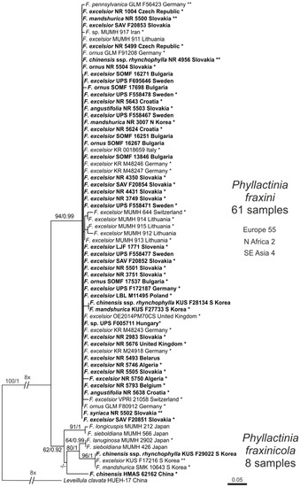 All European and North African samples were identified as P. fraxini (Figure 1). Among the five Asian collections sequenced in this study, three from the Korean peninsula represent P. fraxini. Two other collections obtained in this study, together with all six Asian collections retrieved from GenBank, are P. fraxinicola. The Iranian sample retrieved from GenBank is P. fraxini. In further analyses, we included 55 European and 2 North African records of P. fraxini, 3 Southeast Asian records of the same species, and 8 Southeast Asian records of P. fraxinicola.