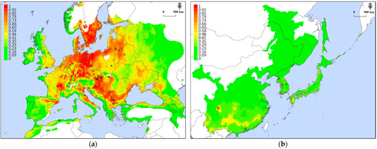 The environmental space used in further habitat modeling and niche analyses was defined based on the known distribution of Fraxinus species that were confirmed as hosts of Phyllactinia in Europe and Southeast Asia. In Europe, all three native species, F. angustifolia Vahl, F. excelsior, and F. ornus L., are known as the hosts. The potential distribution of ash-dwelling Phyllactinia in Europe is estimated as a joint distribution of the three ash species [36,37,38]. Asian samples were collected on F. mandshurica, F. chinensis, F. excelsior, F. lanuginosa Koidz., F. longicuspis Siebold & Zucc., Fraxinus. chinensis ssp. rhynchophylla (Hance) A.E. Murray, and F. sieboldiana Blume. We were able to find a well-defined distribution range only for F. mandshurica [39]. The potential distribution area of Phyllactinia in Southeast Asia was estimated as the known distribution of F. mandshurica pooled with the estimated distribution of other Asian species [2,40,41].