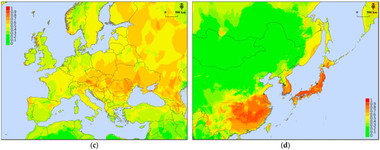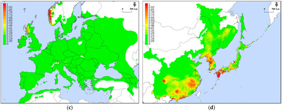 Future climate scenarios modeled for the year 2050 and confirmed current occurrences: (a) Phyllactinia fraxini in Europe, (b) P. fraxini in Southeast Asia, (c) P. fraxinicola in Europe, and (d) P. fraxinicola in Southeast Asia. The horizontal scale bar refers to the probability of distribution (1, high habitat suitability; 0, not suitable).