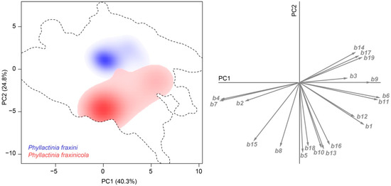 Differences in P. fraxini (blue) and P. fraxinicola (red) environmental niches in principal component space based on bioclimatic variables. Shading is proportional to the density of species occurrence. A dashed line indicates the available environmental space. Vectors of the bioclimatic variables show their contribution to the principal components. Variance explained by the components is given in parentheses. The variable abbreviations are explained in Table 1.