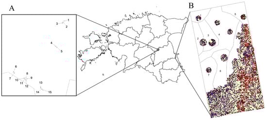 Location of study sites. (A) Placement of Estonian Network of Forest Research Plots (ENFRP) plots in central Estonia in the Laeva municipality. (B) Measured areas in the Järvselja old-growth compartment following the numbered sub-compartments. The locations of mapped standing live and dead trees are presented (green dots—live trees, blue dots—dead trees, red dots—standing snags). The detailed plot of tree locations in the Laeva site are presented in supplementary materials Figure S3.