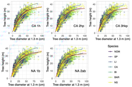 Empirical forest growth and yield models depend on the relationship observed between dendrometric variables like tree height and diameter or basal area at breast height. For managed conditions, these models assume constant allometric relationships [2,6]. This is not valid in the case of either long term natural forest dynamics [3,4] or intra- and interspecific variability in trees, relating to changes in stress tolerance and climate-related functional traits [44,45]. In the naturally developing stand conditions, the use of H-D functions has both pros and cons. In the case of the standard analysis of ground-based plot or stand measurements, the use of the H-D relationship is justified, especially when the height and diameter measurements are scarce and do not cover all trees. The use of height curves then avoids irregular and illogical extrapolation. At the same time, the use of two or three-parameter functions may not be flexible enough to describe the full range of the variability in the H-D relations in natural conditions. While under natural conditions, the distribution of the input variable is a more challenging feature, the managed forests have a stronger clustering with a higher distinction of the species clusters according to the diameter. While nlme models achieve a very good estimation on the H-D relation, in both cases, it is visible in Figure 4 for the Laeva data set that the high-density of data between 25 to 50 cm diameter and the cluster below 10 cm diameters do not match well the data right at the inflection point of the growth curves. For this reason, we used height curve assumptions of free numeric smoothing technique in our comparison of Järvselja old-growth and Laeva managed forests.