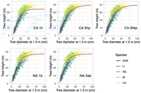 Mixed-effects models for the dataset of the managed forest in Laeva. The nomenclature of the models is the same as described in Figure 2. Similarly, the colors denote the species subject to the fitting, and dots are data and lines the modeled relationships per species. The red line denotes again the overall relationship found by the nonlinear mixed-effects model fit to the data. Tree species are as follows: BI = silver birch and downy birch; NS = Norway spruce; GAR = gray alder; LI = lime family; CA = common aspen.