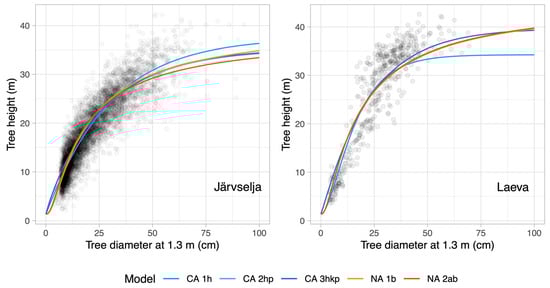 Depending on the number of parameters of the fixed model, we employed the random factor to set up different models to test with the data. For the Chapman model, three models were calculated, and we let the tree species as random effect influence one (CA1h), two (CA2hp) or all three (CA3hkp) parameters. These were chosen from the set of a total of 7 possible combinations that include random effects of the Chapman model. In the case of the Näslund equation, the two parameters of the fixed-effects model allowed for two different mixed models, out of possible three, where the random effects influenced either one (NA1b) or both (NA2ab) parameters. The choice of parameter combinations was due to the prior knowledge that naturally developing stands have a higher variation in height growth [7,11,14,20]. Altogether, by this, we achieved five models that were fitted to the data of the unmanaged old-growth forest in Järvselja and the managed forest in Laeva.