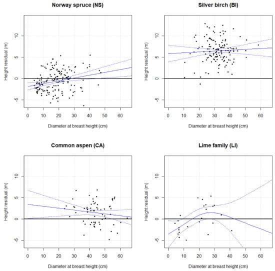 The differences between the model estimations, even large ones, in the onset of the growth curves did not impact the goodness of fit because there were no data. In that case, the regression algorithm cannot give any criteria and strictly taken the estimated curve was not valid in that region [43]. Another situation occurred at the end of the curve; there fewer and fewer measurements were available, and therefore, the regression was dominated by the cluster of data with the most measurements. In our case, Norway spruce and lime data had the highest density of measurements at a diameter range between 7 to 30 cm, while birch data were generally scarcer, and the density was higher between diameters 10 to 20 cm. In general, the data clouds we used had a log-normal density distribution in both dimensions, and the estimated growth curves were very similar where the density of measurements was high, but towards the higher diameters, with scarcer data, the estimates differed strongly. While the dispersion in the data carried some information on the stand characteristics, it did not improve the fit. On the contrary, additional measures like constraining the parameter [19] or including a weight function into the fit process may be needed to find appropriate results [18]. Using nonlinear mixed-effect models that included the species as random effect yielded sufficiently accurate estimates of the H-D relationship even in the cases when single species could not reach a parameterization in the fixed-effect model. In his work from 1936 [37], Näslund stated that “a subjective choice of stems” have been made, which is a bit like binning if selected from mean sized trees.