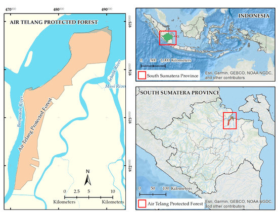 This research was conducted in the Air Telang Protected Forest (ATPF), a coastal forest landscape dominated by mangroves with an area of 12,660 ha, located in South Sumatra Province, Indonesia (Figure 1). According to the literature [22], the ATPF is covered by true and associated mangroves dominated by Nypa fruticans, Rhizophora apiculate, and Acrostichum aureum.