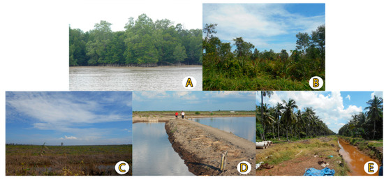 The imagery data were obtained from Landsat 5 imagery for the years 1985 and 2000, and Sentinel-2 for the year 2020 (see Table 1 for the detailed satellite image information used in this study). Forestry thematic maps and relevant land cover maps obtained from the Provincial Forestry Service were used to support land cover classification and to improve the accuracy of the classification results. Additionally, a series of land cover ground checks were conducted in 2000 for primary mangrove forests, secondary mangrove forests, coconut plantations, fishponds, and open areas, as summarized in Table 2. The collected coordinates of each land cover were used for training points during the classification analysis and accuracy test. Coordinates were collected using a handheld Geographical Positioning System (GPS), as shown in Table 2. The pictures of each land use field condition obtained during the ground check fieldwork are presented and summarized in Figure 2.