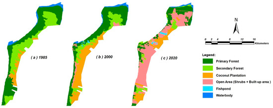 We observed that the area of both primary and secondary forests decreased significantly over the period of 35 years (1985–2020), as summarized in Table 4. In 1985, the primary forest was 6257 ha (49.42% of total ATPF area), and after 35 years, the remaining primary mangrove forest area was only 2936 ha (23.19%). This change indicates a substantial loss of primary forest of more than 50% over the mentioned period. Similarly, the area of the secondary forest was also reduced significantly from 36.56% in 1985 to only 8.87% in 2020. In contrast, we identified a significant increase in open area (deforested forest), of nearly 50%, from the initial analysis year. Similarly, the coconut plantation area increased by 21% between 1985–2000, but decreased by 15% between 2000–2020. Finally, the fishpond area continued to increase during the entire analysis period of 1985–2020, despite the area of increase being only 189 ha or around 1.5% of the latest total ATPF area.