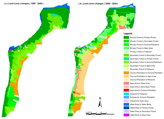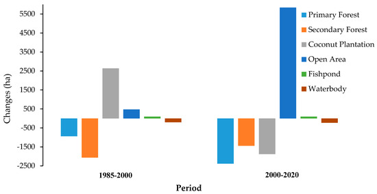During the first and second time periods, there was a decrease in the area of the primary forest by 935 and 2385 ha, respectively. During these same two time periods, secondary forests also experienced a decline of 2064 and 1440 ha, respectively (Figure 4). Coconut plantations expanded by 2638 ha over the 1985–2000 period, but decreased by 1878 ha over the 2000–2020 period (Figure 4). Similarly, the deforested area expanded by 1878 ha in the second period. The fishpond area increased in the two periods compared with only less than 100 ha or 1% in 35 years. Similarly, a reduction in the water body area also occurred in these two periods (Figure 4).