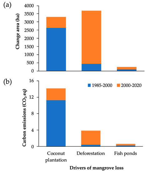 Throughout 1985–2020, we observed that the largest mangrove loss in ATPF was driven by deforestation (3693 ha), followed by coconut plantations (3315 ha) and fishponds (245 ha; Figure 6 and Table 5). Coconut plantations were the primary mangrove loss driver before 2000, while deforestation largely occurred after 2000 (Figure 6a). However, we estimated the largest carbon emissions were from coconut plantation conversion throughout all of the analysis periods, with the total carbon emissions being approximately 14.14 Mt CO2-eq (Figure 6b). These amounts were almost four times higher than the emissions from deforestation, even though they impacted a larger area of mangrove loss (Figure 6). During 1985–2000 alone, mangrove conversion to coconut plantations generated the largest carbon emissions, around 11.23 Mt CO2-eq or 94% of the total emissions over this period. Moreover, the largest carbon emissions from mangrove deforestation were 3.42 Mt CO2-eq, occurring during 2000–2020. We observed a low area change impacted by fishpond development in ATPF throughout the analysis years.