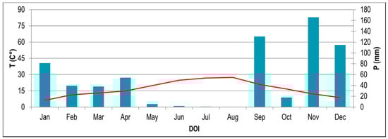 Climatic diagram of monthly mean temperatures (T, red line) and total precipitation (P, blue bars) for 2017 according to data recorded at the Sant’Anastasia meteorological station.