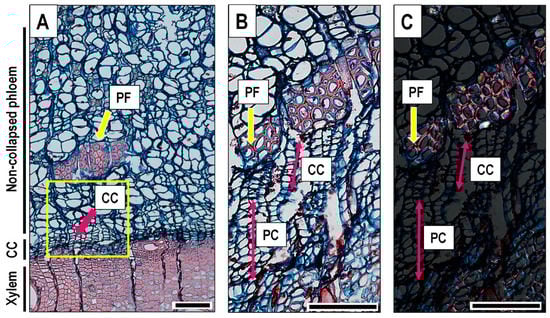 Cross section of Quercus ilex. (A) Non-collapsed phloem, xylem, and cambial zone; the pink arrow indicates the cambial cells (CC), the yellow arrow points towards the group of phloem fibres (PF). (B) The pink arrows indicate the CC and post-cambial cells (PC), the yellow arrow shows the developing phloem fibre (PF). (C) The same section zone as picture (B) but viewed under polarised light. Scale bars = 100 µm.