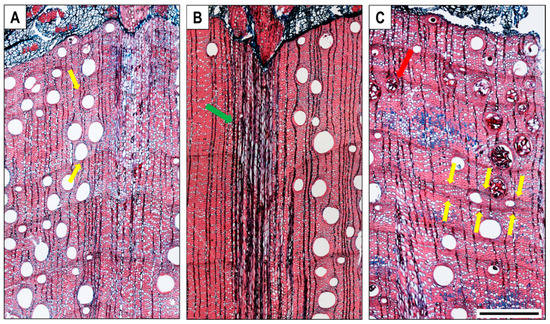 Cross-section of microcores from three different Q. ilex trees showing (A) tree-ring structure without clear latewood (yellow arrows), (B) multiseriate ray (green arrow), and (C) wedging ring (yellow arrows) and tyloses (red arrows). All images are of the same magnification; scale bar = 500 µm.
