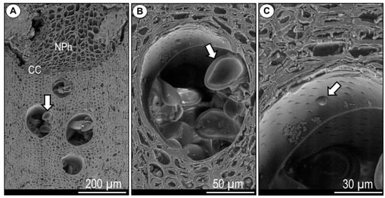 Cross-section of Q. ilex wood: (A) vessels with tyloses (arrow) in the last formed xylem increment below the cambium (CC) and non-collapsed phloem (NPh), and (B) detailed view of a vessel with tyloses from (A), and visible starch grains in parenchyma cells; (C) the beginning of tylosis formation with proliferation of a parenchyma cell into a vessel lumen through the vessel pit.